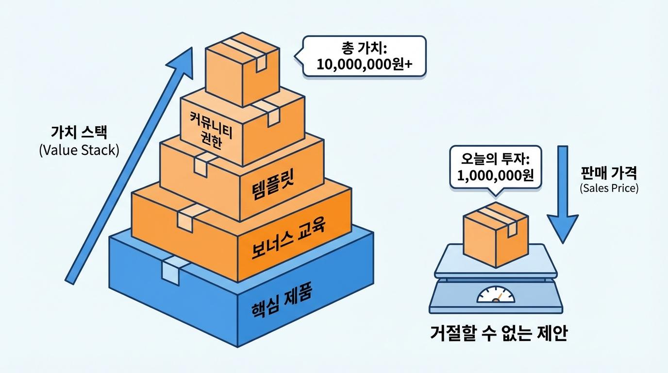 이를 해결하는 마법 같은 도구가 바로 스택 슬라이드입니다. 제안의 마지막 단계에서 당신이 제공하는 모든 구성 요소를 하나하나 다시 나열하며 시각적으로 쌓아 올리는 것이죠. 핵심 제품부터 시작해 보너스 교육, 템플릿, 커뮤니티 권한 등을 차례로 보여주며 각각의 주관적 가치를 합산해 보여주어야 합니다. 이렇게 가치를 눈앞에 산처럼 쌓아두면, 실제 판매 가격은 그 거대한 가치 더미 옆에서 아주 사소하고 합리적인 투자로 느껴지게 됩니다. "이 모든 것을 합치면 1,000만 원 이상의 가치가 있지만, 오늘 당신의 투자는 단 100만 원입니다"라고 말하는 순간, 고객은 손실에 대한 두려움이 아니라 기회를 놓칠까 봐 조바심을 느끼기 시작합니다.