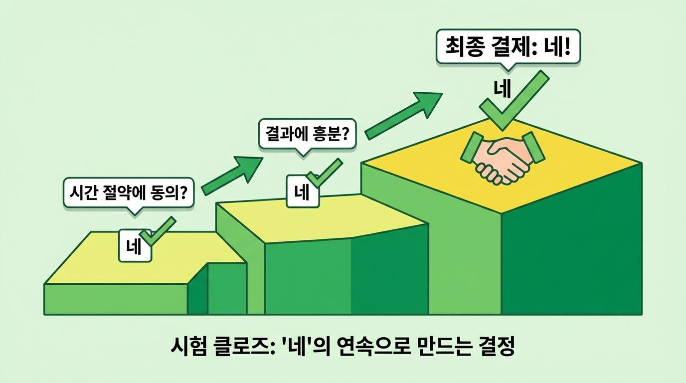 "이 방법이 여러분의 시간을 아껴줄 것 같지 않나요?", "이런 결과를 얻는다면 정말 신나지 않을까요?"와 같은 질문들은 고객의 뇌가 긍정적인 대답을 하도록 훈련시킵니다. 수십 번의 "네"를 반복하며 고개를 끄덕인 고객은, 마지막 결제 제안이 왔을 때도 자연스럽게 "네"라고 답할 준비가 됩니다. 시험 클로즈는 단순히 동의를 구하는 것이 아니라, 당신과 고객 사이에 심리적 공감대를 형성하고 구매에 대한 두려움을 단계적으로 허무는 과정입니다.