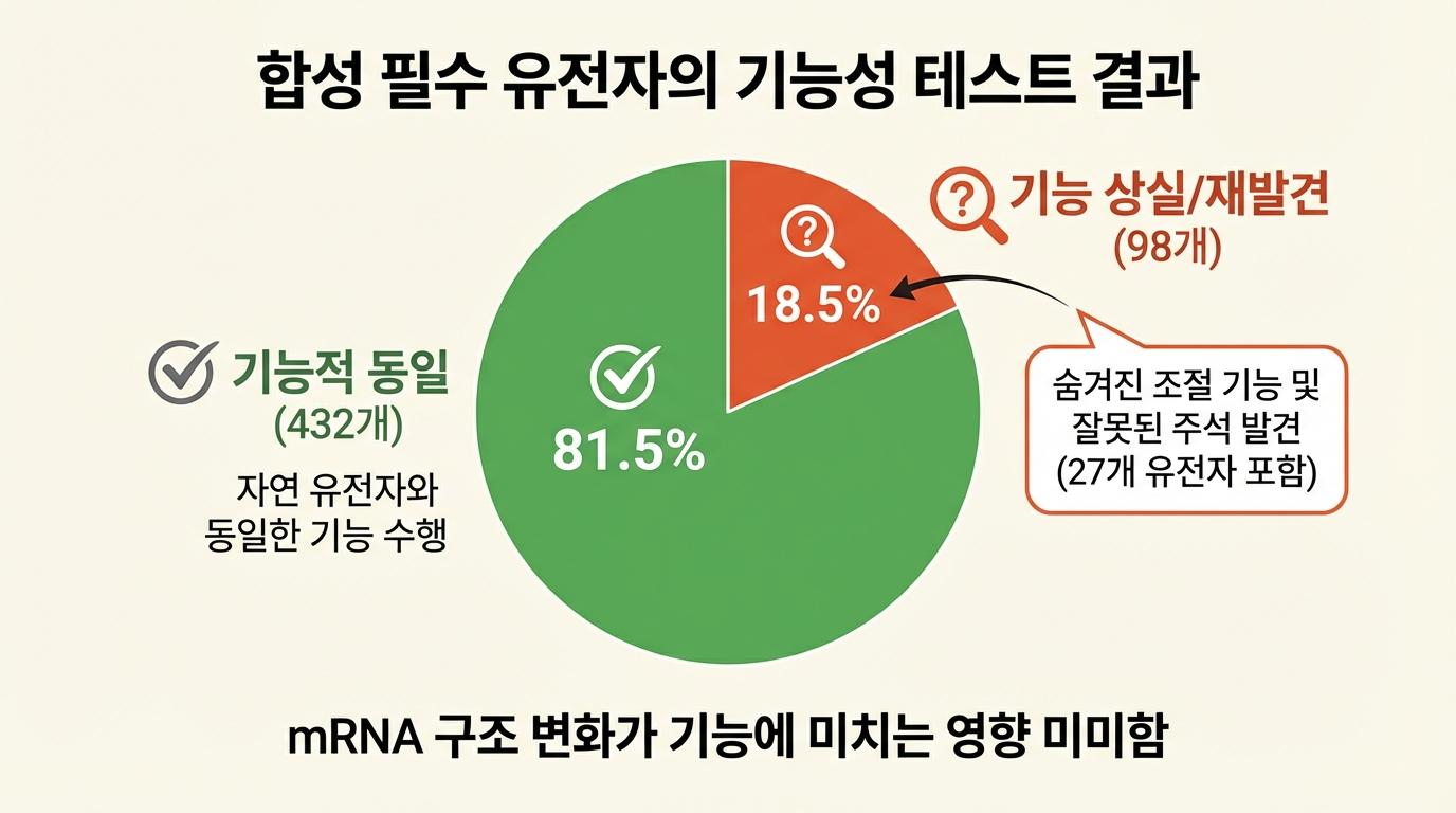 이를 확인하기 위해, 합성된 유전체의 조각들을 실제 박테리아에 넣어 그 기능을 테스트했습니다. 결과는 놀라웠습니다. 새롭게 설계된 필수 유전자 중 약 81.5%가 자연 유전자와 완벽하게 동일한 기능을 수행하는 것이 확인되었습니다. 이는 DNA의 ‘철자’를 대대적으로 바꾸더라도 생명이 가진 본연의 ‘의미’는 충분히 유지될 수 있음을 증명한 획기적인 결과입니다. 유전 정보의 표현 방식에 상당한 유연성이 존재한다는 사실을 명확히 보여준 것입니다.