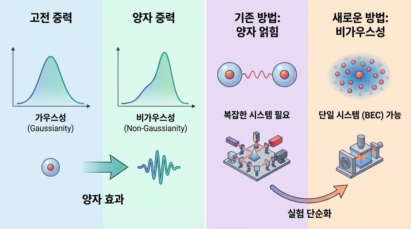 이는 마치 범죄 현장에 남겨진 범인의 고유한 지문과도 같습니다. 우리가 어떤 물질의 양자 상태를 정밀하게 측정하여 여기서 '비가우스성'을 발견한다면, 이는 중력이 양자 세계의 규칙을 따른다는 매우 강력하고 직접적인 증거가 됩니다. 이 접근법은 기존에 논의되던 '양자 얽힘'을 이용한 실험보다 훨씬 명확한 신호를 포착할 수 있다는 장점이 있습니다. 더 나아가, 여러 개의 양자 시스템을 복잡하게 얽히게 만들 필요 없이 '보스-아인슈타인 응축'과 같은 단일 양자 시스템만으로도 실험이 가능해, 가까운 미래에 실현 가능성이 매우 높은 것으로 평가됩니다.