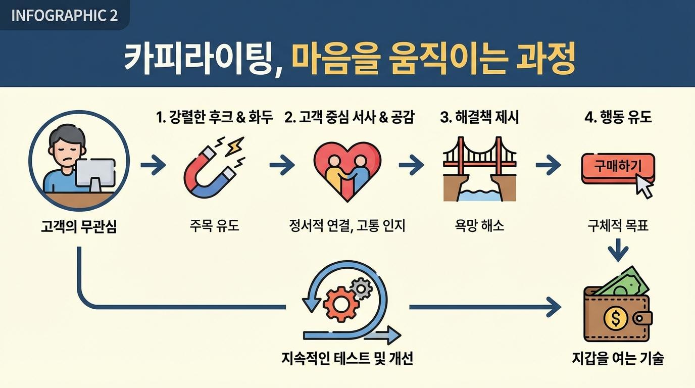 카피라이팅의 핵심은 나에 대한 이야기가 아닌 철저히 고객 중심의 서사를 구축하는 데 있습니다. "우리가 무엇을 팔고 있는가"보다 "이것이 당신의 삶을 어떻게 바꿀 것인가"에 집중해야 합니다. 고객은 판매자의 사정에는 관심이 없으며, 오직 자신의 문제가 해결되고 욕망이 채워지는 결과에만 반응하기 때문입니다. 고객의 고통을 명확히 인지하고, 그 고통을 해소해 줄 해결책을 제시하는 것이 중요합니다.