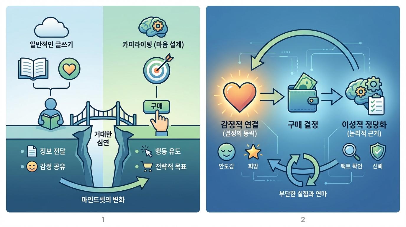 평범한 글쓰기가 정보의 전달이나 감정의 공유를 목적으로 한다면, 카피라이팅은 철저히 독자의 행동을 이끌어내기 위한 전략적 수단입니다. 정보를 나열하는 데 그치지 않고, 독자가 링크를 클릭하거나 구매 버튼을 누르게 만드는 구체적인 목표를 가집니다. 이러한 차이는 글을 대하는 태도, 즉 마인드셋의 변화에서 시작됩니다.