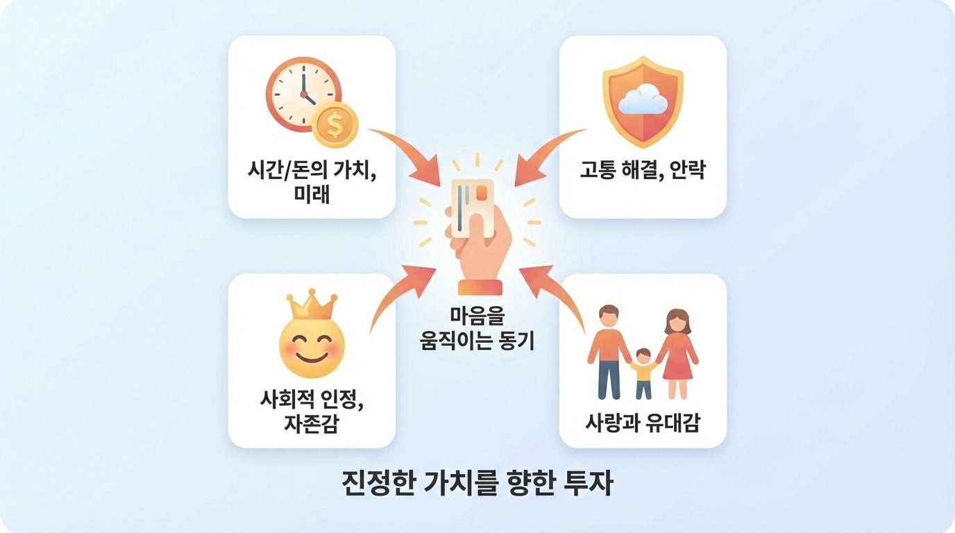 이처럼 모든 구매 행위는 궁극적으로 자신 또는 자신이 아끼는 이들의 행복과 만족을 추구하는 과정입니다. 고객의 마음을 움직이려면, 우리의 제안이 그들이 지향하는 행복의 모습에 어떻게 기여할 수 있는지를 명확하게 보여주어야 합니다. 이는 단순히 상품의 기능을 설명하는 것을 넘어, 그 상품을 통해 경험하게 될 가치와 감정을 전달하는 일입니다.