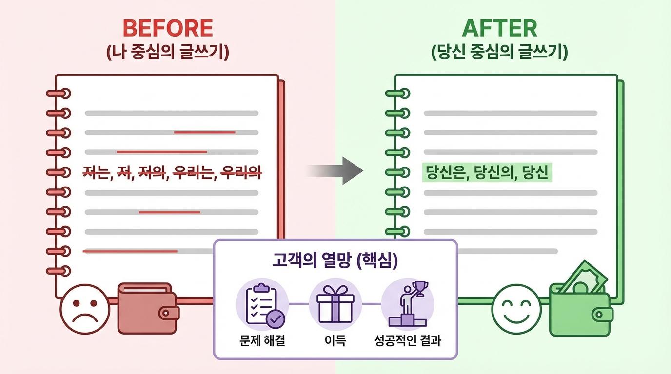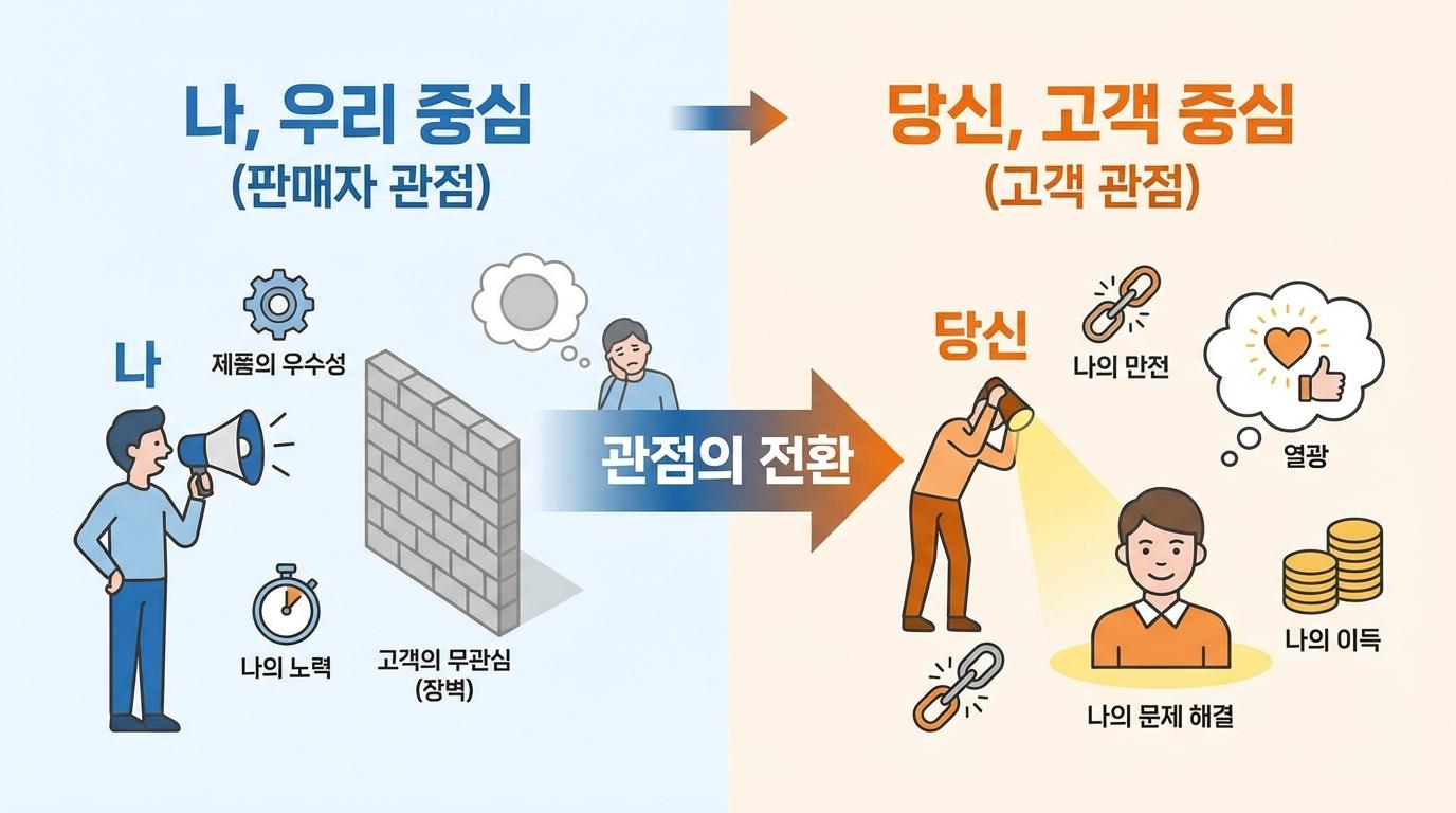 따라서 효과적인 마케팅 글쓰기를 위해서는 ‘나’ 중심의 관점에서 벗어나 철저히 ‘당신(고객)’ 중심의 관점으로 전환해야 합니다. 고객은 당신의 자녀가 어떤지, 당신이 얼마나 힘든 하루를 보냈는지 궁금해하지 않습니다. 그들은 오직 자신의 문제 해결과 이득에만 관심이 있습니다. 이 냉정한 현실을 직시하는 것이 고객의 마음을 움직이는 가장 기본적인 원칙입니다.