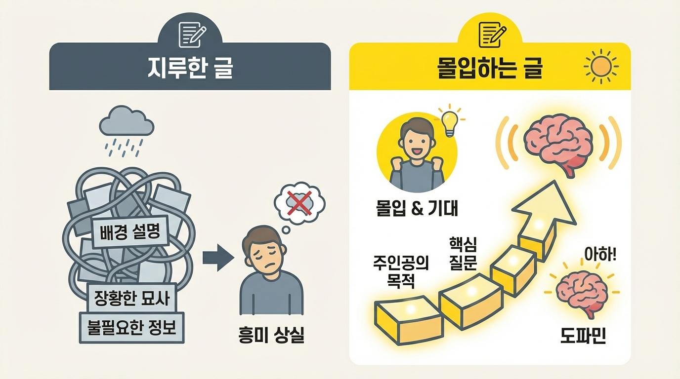 성공적인 글쓰기는 삶에서 지루한 부분을 뺀 나머지라고 말할 수 있습니다. 여기서 지루한 부분이 의미하는 것은 주인공의 목표와 아무 상관이 없고 그에게 어떤 영향도 줄 수 없는 모든 요소입니다. 글의 날씨 묘사, 배경 설명, 심지어 문체의 톤조차 독자가 죽도록 알고 싶어 하는 '주인공은 목적을 달성할 것인가?'라는 질문에 기여해야 합니다. 독자를 사로잡는 진정한 힘은 화려한 문체나 아름다운 비유에서 오는 것이 아닙니다. 다음에 일어날 일을 알고 싶게 만드는, 뇌 속의 도파민 분비에서 나옵니다. 독자가 글의 흐름을 따라가며 다음 내용을 궁금해하고 예측하게 만드는 잘 설계된 이야기가 언제나 잘 쓴 문장보다 강력한 이유가 여기에 있습니다. 불필요한 모든 것을 걷어냈을 때 비로소 독자는 주인공의 감정에 온전히 몰입하며, 당신이 설계한 이야기의 지도를 따라 밤을 지새우게 될 것입니다.