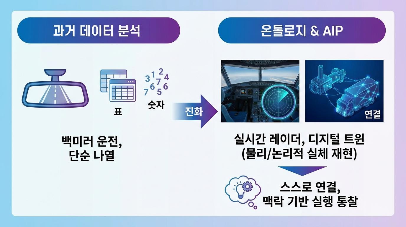 과거의 데이터 분석이 백미러를 보며 운전하는 것이었다면, 온톨로지는 비행기를 조종하며 실시간 레이더를 보는 것과 같습니다. 기존의 데이터베이스가 단순히 표와 숫자의 나열이었다면, 온톨로지는 기업의 실질적인 물리적 실체와 논리적 관계를 디지털 세계에 그대로 재현합니다. 예를 들어 공장의 부품 하나, 배송 중인 트럭 한 대를 단순한 코드가 아닌 생생한 개체로 정의합니다.