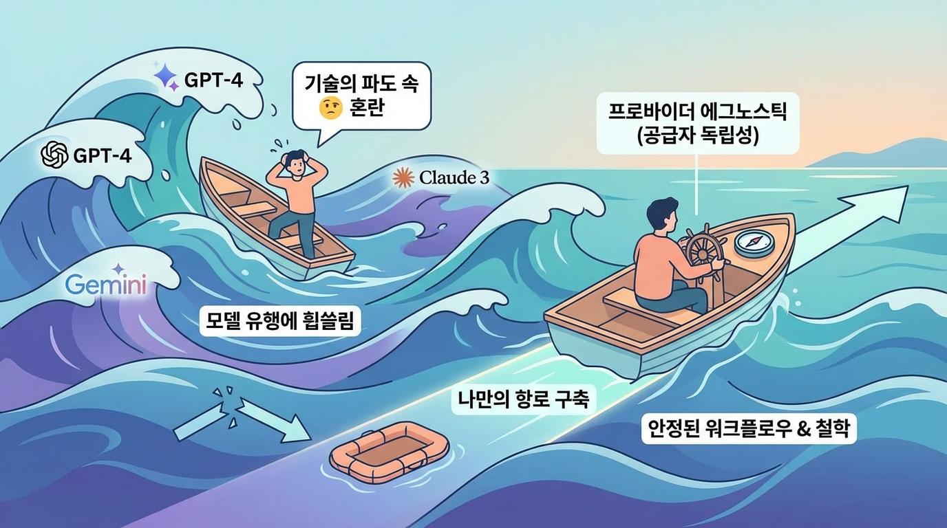 최근 인공지능 모델 공급자들의 정책 변화를 보면, 자신들의 SDK나 클라이언트를 통하지 않은 접근에 대해 제한을 두려는 움직임이 포착됩니다. 이는 플랫폼 기업들이 흔히 취하는 폐쇄적 전략으로, 소프트웨어 개발 원가를 상승시키고 특정 환경에 종속되는 것은 독립적인 창작자에게 매우 위험한 요소입니다. 따라서 우리는 프로바이더 에그노스틱(Provider Agnostic), 즉 특정 공급자에 의존하지 않는 독립성을 추구해야 합니다.